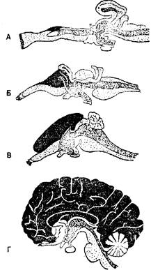 Рис. 4.1. Строение головного мозга у акулы (Л), кролика (Б), ящерицы (В), человека (Г)