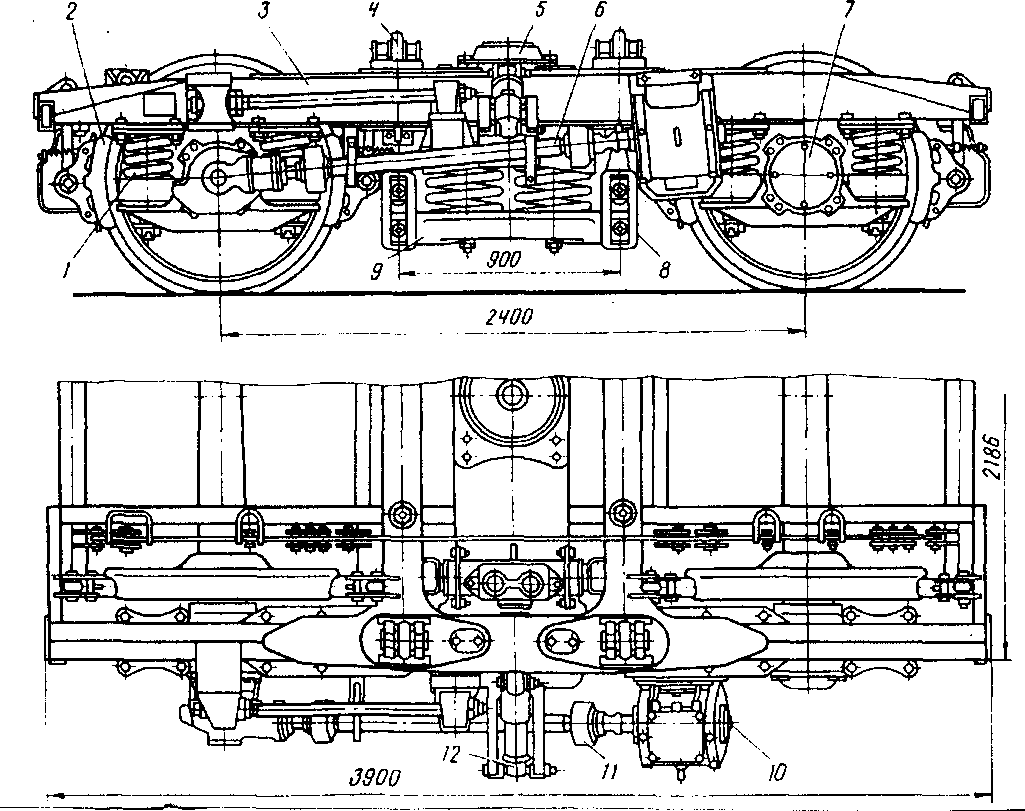 Рис.18. Тележка КВЗ-ЦНИИ типа 1: 1 - надбуксовое подвешивание; 2 - рычажная передача тормоза; 3 - рама; 4 - люлечная подвеска; 5 -подпятник; б - приводной вал генератора; 7 - колесная пара с буксами на роликовых подшипниках; 8 - люлечная серьга; 9 - поддон; 10 - генератор; 11 - муфта; 12- гидравлический гаситель колебаний.