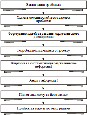 Одним із принципів і найважливішою передумовою досягнення цілей дослідження є дотримання логічної послідовності його етапів. Відповідно до цього алгоритм процесу маркетингового дослідження включає певну послідовність кроків (етапів), показану на рис. 8.