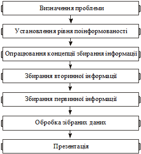 Рис. 9. Процес збирання та інтерпретації Вихідною точкою цього етапу є визначення проблеми, яку необхідно дослідити. Правильне визначення проблеми — це половина майбутнього успіху, оскільки воно встановлює чіткі орієнтири і межі майбутньої роботи, спрямовує дослідника на пошуки необхідної і достатньої інформації. Після цього визначається рівень поінформованості дослідника (тобто кількість і суть як уже наявної в нього інформації, так і — об’єктивними: кількість (повнота), релевантність (змістовність, значущість), точність (однозначність), надійність, зрозумілість, актуальність, пристосованість до мети дослідження; — суб’єктивними: ризикованість, характер (стресовий чи заспокійливий), мотивованість; — економічними: величина витрат, необхідних для збирання та нагромадження інформації; — обмежувальними: захищеність, допустимість інформаційних контактів та засобів зв’язку, рівень захисту інформації. Третій етап процесу — опрацювання концепції збирання інформації. Він полягає в розробці проекту збирання інформації, методів її збирання, альтернативних варіантів (повне чи вибіркове, разове чи періодичне, одно- чи багаторазове дослідження). Четвертий етап — збирання вторинної інформації та перевірка правильності її вибору. Критеріями такої перевірки є характеристика установи чи організації, що збирала дані, відповідність інформації поставленим завданням, методи та час збирання, актуальність зібраних даних. За недостатності зібраної інформації переходять до польових досліджень (збирання первинної інформації). Після цього зібрані дані підлягають обробленню (зведенню у відповідні таблиці, кресленню діаграм, графіків із належними комента- Наступний етап процесу — аналіз даних. На цьому етапі інформаційна «сировина» перетворюється на відповідні висновки і рекомендації. Останні подаються у звіті, що його захищають перед замовником. Це — останній етап процесу збирання інформації. У своїй діяльності з інформаційного забезпечення маркетингових рішень підприємств завжди натрапляють на цілу низку проблем: дефіцит необхідної або надлишок непотрібної інформації, розпорошення інформації в різних підрозділах підприєм- МІС — це спеціалізована постійна структура, яка складається з відповідного персоналу та обладнання і здійснює конкретні процедури, метою яких є збирання, аналіз, оцінка і подання інформації, необхідної для поліпшення планування процесу маркетингу, його здійснення і контролю (рис. 10). Підсистема збирання інформації — це набір процедур та перелік джерел для отримання даних про поточні події, які відбуваються в навколишньому бізнес-середовищі.