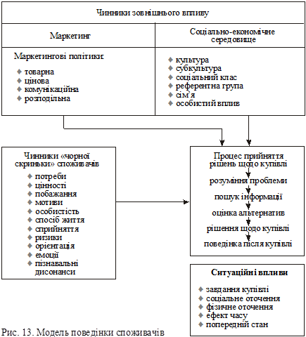 де R — обсяги виробництва товару в країні; Р — залишки товарних запасів на складах підприємств-виробників; Е — експорт; F — імпорт; Д(–М) — зменшення (збільшення) запасів товарів; Ео — непрямий експорт; Fо — непрямий імпорт. Можливі два підходи до визначення місткості ринку: — ринкове агрегування: ринок розглядають як одне неподільне ціле; — ринкове сегментування — ринок розподіляють на окремі однорідні частини (сегменти) або проводять типологізацію споживачів за окремими однорідними групами. Ринкове сегментування може бути проведене з використанням двох підходів. Перший підхід — сегментування за характерними ознаками продукції (призначення, вартість, відповідність моді, популярність, технічна складність, міра новизни тощо). За другим підходом сегментування здійснюється з використанням характеристик та особливостей поведінки споживачів: а) за географічними ознаками: країна, регіон, тип населеного пункту, клімат, густота населення; б) демографічними ознаками: вік, стать, сімейний стан, склад сім’ї; в) психографічними ознаками: спосіб та стиль життя, тип особистості; г) соціально-економічними ознаками: соціальний клас, вид занять, рівень доходів, структура витрат; д) культурними ознаками: освіта, релігія, традиції, цінності; е) параметрами поведінки: причини купівлі, статус користувача, міра потреби в продукції, емоційне ставлення до про- Прогноз збуту (продажу) — це визначення того, що підприємство розраховує продати, виходячи із існуючої кон’юнктури, ринкового потенціалу і власних можливостей. Відомі некількісні та кількісні методи прогнозування збуту. Некількісні методи — це експертна оцінка майбутніх обсягів збуту підприємства. Як експертів використовують працівників вищого та середнього менеджменту підприємства, торговельних агентів, покупців, незалежних фахівців. З-поміж кількісних методів найвідомішими є множинна регресія (пошук рівнянь, які описують залежність майбутніх обсягів збуту від набору незалежних змінних), кореляційний аналіз, аналіз рядів динаміки, прогнозування на основі частки ринку, метод стандартного розподілу ймовірності та ін. Особливу актуальність у системі маркетингових досліджень ринку має вивчення поведінки споживачів. Якісний і кількісний склад, що і навіщо вони купують, хто бере участь у процесі купівлі, коли, де і за яку ціну вони купують? У сучасному розумінні поведінка споживачів — це всі ті економічні, соціальні і психологічні аспекти, які мають місце в процесі підготовки і здійснення купівлі, а також використання придбаного продукту, включаючи передання набутого досвіду іншим; це дії, які здійснюють окремі особи купуючи і використовуючи продукцію чи послуги, це розумові і соціальні процеси, які передують цим діям або настають за ними. Для оцінки поведінки споживачів використовується інтердисциплінарний підхід. Так, економічні науки допомагають знайти відповідь на запитання, який дохід мають споживачі і як вони його розподіляють, за якою ціною вони хотіли б придбати той чи інший продукт, як можна оцінити величину попиту і пропонування товарів тощо. Психологія допомагає зрозуміти мотиви і стимули поведінки споживачів, етнографія — особливості походження, розселення, стосунків, культури і побуту народів, симптоматологія — зовнішні ознаки як виявлення сутності явищ, герм