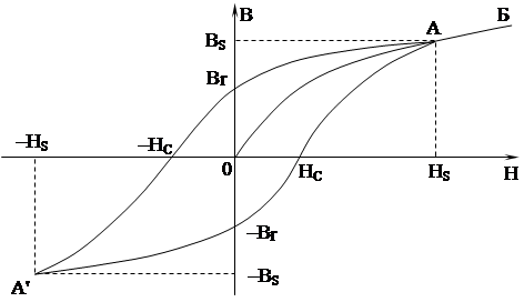 Петля гистерезиса. Для достижения полной размагниченности образца к нему необходимо приложить поле определенной напряженности и противоположное по знаку. Напряженность такого поля называют коэрцитивной силой НC. При дальнейшем увеличении отрицательного поля индукция тоже становится отрицательной и в точке А' при Н = НS достигает значений индукции технического насыщения: В = – ВS. После уменьшения отрицательного поля, а затем увеличения положительного поля кривая перемагничивания опишет петлю, называемую петлей магнитного гистерезиса (см. рисунок).