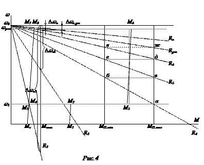 Через точки и , соответствующие пересечению естественной характеристики с линиями моментов и , проводят линию до пересечения с горизонталью . Через полученную точку пересечения проводят луч . Пересечение с линией – точка . Из точки проводят горизонталь до пересечения с линией (точка г) и через эту точку луч . Пересечение с линией – точка и т.д. Построение производят до тех пор, пока горизонталь не пересечет естественную (при работе с - реостатную) характеристику при моменте (точка а)[2]. В противном случае необходимо симметрично изменить пределы и и повторить построение.