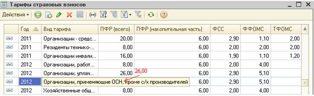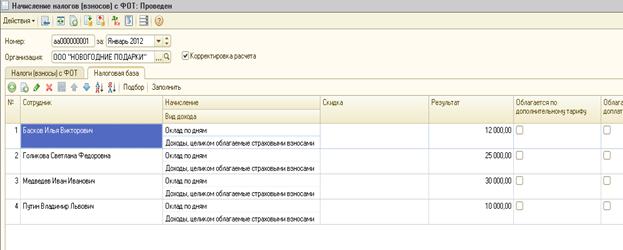 Сначала убедимся, что ставки налогов заданы. По траектории «Зарплата – Начисление налогов (взносов) с ФОТ» откроется документ.