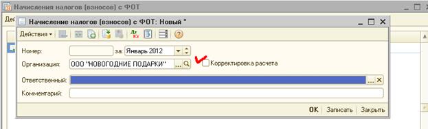 Появится окно, в котором введем Ответственный и поставим галочку в окне Корректировка расчета
