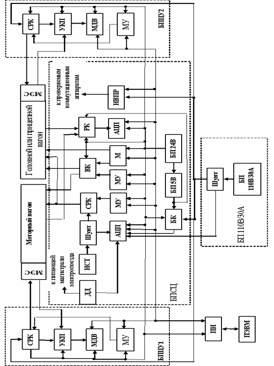 Система АСТДЭ состоит из отдельных функциональных блоков (блок проверки силовых цепей БПСЦ, блоки проверки цепей управления БПЦУ1 и БПЦУ2, блок питания БП 110В/30А), выполняющих обособленный набор задач. Структурная схема системы приведена на рисунке 9.1. Блок проверки силовой цепи БПСЦ конструктивно выполнен в виде шкафа со съемными боковыми стенками. Внутри шкафа расположены измерительные и коммутационные модули, источник стабилизированного тока, мегомметр, высоковольтный коммутатор, блок питания. Разъемы для подключения блоков БПЦУ1 и БПЦУ2 расположены на верхней панели шкафа, а разъемы для подключения к источнику напряжения и проверяемым цепям на нижней панели шкафа. Блоки проверки цепей управления БПЦУ1 и БПЦУ2 конструктивно выполнены в виде шкафов, внутри которых расположены измерительные и коммутационные модули, платы нормализаторов сигнала. Разъемы для подключения измерительных, силовых и интерфейсных кабелей расположены на верхней панели шкафа. Блок питания 110В/30А конструктивно выполнен в виде шкафа, с открывающимися боковыми стенками. На лицевой панели источника напряжения располагаются измерительные приборы, измерительный разъем для подключения к блоку БПСЦ. Кнопки «Включение», «Отключение» и сигнальная лампа «Сеть» расположены на верхней крышке. Внутри шкафа расположены: панель ввода, понижающий трансформатор, панель диодов, автоматы защиты, шунт измерительный, клеммная колодка для подключения блоков БПСЦ, БПЦУ1, БПЦУ2. Управляющая ПЭВМ располагается в комнате оператора (операторской). Подключение ПЭВМ к блоку БПСЦ осуществляется через преобразователь интерфейса с помощью соединительного кабеля.