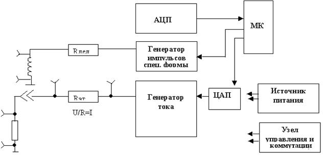 10.3.2 Работа модуля «URL» (измерительного модуля) Измерительный модуль представляет собой устройство, предназначенное для: · измерения постоянного и переменного напряжения; · измерения активного сопротивления постоянному току; · измерения индуктивности; · измерения времени срабатывания аппаратов и реле (совместно с модулем «Экспресс»); · определения коэффициента трансформации в двигателях (совместно с модулем «Экспресс»); · передача измеренных значений по последовательному интерфейсу на центральный процессор Модуль «URL» представляет собой функционально законченное устройство, работающее от внешнего источника постоянного напряжения 48±12 В. Управление происходит через гальванически развязанный последовательный порт персонального компьютера типа IBM PC/AT по протоколу RS-232. Потребляемая мощность по цепи питания не более 15 Вт. Конструктивно модуль выполнен на печатной плате 217, 5*100 мм с двухсторонним расположением элементов. К печатной плате крепится радиатор, на котором закреплены силовые транзисторы. На одной из торцевых сторон платы расположен разъём для связи с системным блоком СКД и напряжением питания самого модуля. На другой торцевой стороне закреплена лицевая планка, на которой расположены выходные разъёмы. Печатная плата помещена в стандартный экран размером 3U. Условия эксплуатации в составе СКД. · температура окружающей среды для рабочего состояния - от плюс 10 º С до плюс 35 º С; · относительная влажность воздуха – от 50 % до 80 % при температуре плюс 25 º С; · атмосферное давление – от 84 до 106, 7 кПа. Модуль «URL» состоит из следующих составных частей: · генератор тока; · генератор импульсов специальной формы; · узел управления и коммутации; · узел питания; · аналого-цифровой преобразователь (далее АЦП). Структурная схема модуля «URL» изображена на рисунке 10.19.