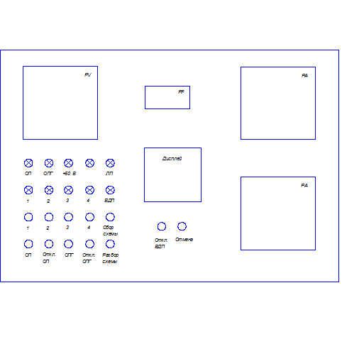 1 – цифровой вольтметр PV1; 5 – цифровой амперметр РА1; 2 – блок световой индикации; 6 – блок кнопочных переключателей; 3 – индикатор частоты вращения ТЭД; 7 – цифровой амперметр 4 – жидкокристаллический дисплей;