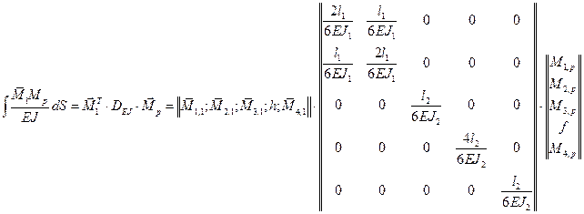 Построение эпюр моментов следует сопроводить расчетами. Эпюры изгибающих моментов надо строить со стороны растянутых волокон. Прежде чем строить любую эпюру (от нагрузки или единичной силы), как известно, необходимо определить опорные реакции. При этом надо не забывать о возможности возникновения горизонтальных составляющих опорных реакций в соответствующих опорах. Вычисление перемещений производится при помощи интеграла Мора с учетом только изгибающих моментов. Интеграл Мора часто вычисляется способом Верещагина. При решении задачи с помощью ЭВМ целесообразно использовать матричную форму записи вычисления интеграла. В общем случае такая запись для какого-то участка (схема А) будет: