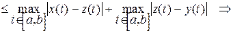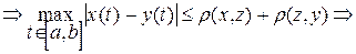 Равенство (1.7) – чебышовское расстояние между функциями x (t) и в (t). Покажем, что функция r (x, y)– метрика на множестве С [ a, b ]. Функция r удовлетворяет первым двум аксиомам метрики. Покажем, что r удовлетворяет аксиоме 3. 3Пусть x, y, z Î С [ a, b ]. Тогда t Î [ a, b ]. Оценим разность ½ x (t) - y (t)½ = ½ x (t) - z (t) + z (t) - y (t)½ £ ½ x (t) - z (t)½ + ½ z (t) - y (t)½ £