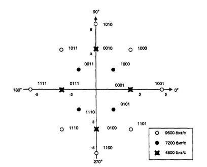 Сигнальна діаграма протоколу V.29 На швидкості 4800 біт/с при об'єднанні в блок двох біт для передачі потрібно чотири елементарних сигнали. У даному випадку ці сигнали мають вигляд звичайної ФМ-4. Двобітний блок утворюють два середніх двійкових знаки комбінацій, зазначених на рис. Протокол V.29 передбачає можливість багатоканальної передачі. Це означає, що замість чотирьох об'єднаних біт можна організувати передачу по чотирьох каналах зі швидкістю 9600/4 = 2400 біт/с. Можливі також комбінації швидкостей 2400, 4800, 7200 біт/с, що дають у сумі швидкість 9600 біт/с. Багатоканальний режим також може бути здійснено при швидкості передачі модему 7200 біт/с (об`єднання до трьох каналів) і 4800 біт/с (два канали по 2400 біт/с). Варіанти конфігурації 1–5 розраховані на групову швидкість 9600 біт/с, варіанти 6-8 – на швидкість 7200 біт/с, а варіанти 9-10 – на швидкість 4800 біт/с. У модемах V.29 застосовується адаптивний коректор (еквалайзер) і скремблер.