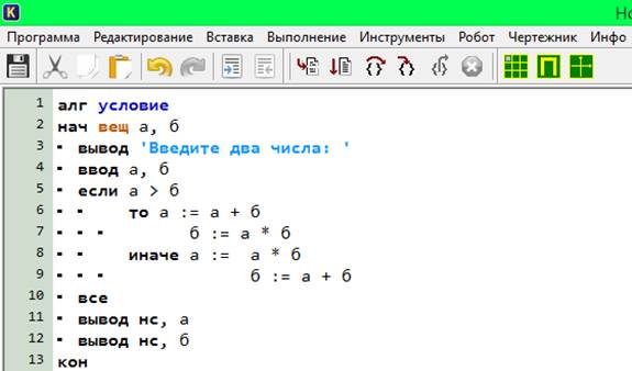 Существуют задачи, в которых требуется организовать выбор выполнения последовательности действий в зависимости от каких-либо условий. Такие алгоритмы называются алгоритмами разветвляющейся структуры. Пример