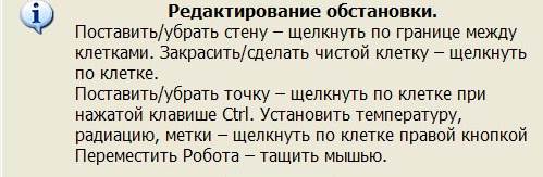 В этом окне можно создавать обстановку для робота. После создания обстановки, для использования, её нужно сначала выбрать. Для этого Робот → Сменить стартовую обстановку. Выбрать нужную из предложенного. Роботом в обстановке можно управлять с помощью пульта.