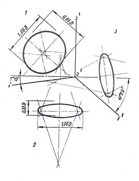 Рис. 10 В ряде случаев, оригиналы могут содержать значительное количество окружностей, плоскости которых параллельны той или иной плоскости проекций. В этих случаях трудоемкость построения прямоугольных аксонометрических проекций существенно возрастает за счет построения значительного количества эллипсов, в которые проецируются эти окружности. Поэтому нужны аксонометрические проекции, в которых такие окружности проецировались бы без искажения. Этому требованию отвечают косоугольные проекции.