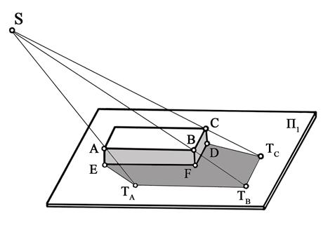Тени придают аксонометрическому изображению предмета большую наглядность. При естественном или искусственном освещении каждая фигура освещается лучами светового источника. Как правило, любой световой источник дает рассеивающие лучи, исходящие из одной точки, при этом часть предмета, обращенная к световому источнику, будет освещенной (светлой), другая часть предмета в это время будет затемнена. Затемненная часть освещенного предмета называется собственной тенью предмета, в отличие от падающей тени предмета, которая получается в результате пересечения касательной плоскости к предмету с той или иной поверхностью. Граница падающей тени образуется лучами, касательными к предмету, от которого падает тень. Касательные лучи образуют поверхности SAB и SBC, которые можно назвать лучевыми (рис.41).