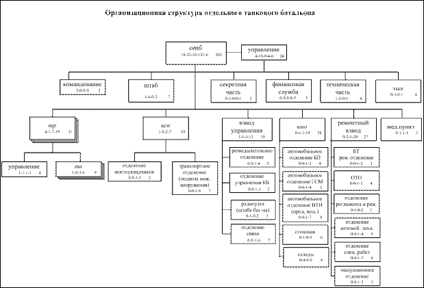 Инженерно-сапёрный взвод (10 чел.) включает: командира взвода (Р-168-5УН – 1 ед., УЗМ-Р – 1 ед.), отделение мостоукладчиков (2 чел., МТУ-72 – 1 ед.), транспортное отделение (подвоза инженерного вооружения) (7 чел., РПГ-7В2 – 1 ед., КМТ-7 – 3 ед., КМТ-6 – 9 чел., БТУ – 3 ед., кран автомобильный КС-2573 – 1 ед., гидрокран автомобильный 4901 – 3 ед., груз. автомобили (под тралы) – 3 ед., прицепы (под тралы) – 6 ед.). Ремонтный взвод (27 чел.) включает: командира взвода, бронетанковое ремонтное отделение (3 чел., МРС-БТ – 1 ед., Р-168-5УТ – 1 ед., УЗМ-Р – 1 ед.), отделение технического обслуживания бронетанковой техники (4 чел., МТО-80 – 1 ед.), отделение регламента и ремонта систем управления огнём (3 чел., КПМ 9В863 – 1 ед.), отделение технического обслуживания автомобильной техники (5 чел., МТО-АМ1 – 1 ед.), отделение специальных работ (8 чел., МРЭ-АМ1 – 1 ед., МЗА-М1 – 1 ед., МРС-АМ1 – 1 ед.), эвакуационное отделение (3 чел., БРЭМ-1 – 1 ед., кран автомобильный КС-2573 – 1 ед., КЭТ-л – 1 ед.). Взвод материального обеспечения (28 чел.) включает: командира взвода, автомобильное отделение подвоза боеприпасов (4 чел., Р-168-5УТ – 1 ед., УЗМ-Р – 1 ед., груз. автомобиль (под боеприпасы) – 4 ед., прицеп (под боеприпасы) – 3 ед.), автомобильное отделение подвоза горючего (5 чел., Р-168-5УТ – 1 ед., УЗМ-Р – 1 ед., АТЗ-7-5557 – 2 ед., АЦ-7, 5-4320 – 3 ед., прицепы-цистерны ПЦ-4, 7-782Б – 3 ед., груз. автомобиль (под ГСМ) – 1 ед., прицеп (под ГСМ) – 1 ед.), автомобильное отделение подвоза вещевого и военно-технического имущества (5 чел., Р-168-5УТ – 1 ед., УЗМ-Р – 1 ед., УАЗ-2966 (для обеспечения служебной деятельности) – 1 ед., груз. автомобиль (под имущество штаба) – 1 ед., груз. автомобили (под ВТИ) – 2 ед., спецаппаратные СА14С – 1 ед.), столовая (9 чел., ПАК-200 – 1 ед., АФК-66 – 1 ед., груз. автомобиль (под кухни и продовольствие) – 1 ед., КП-130 – 1 ед., ЦВ-1, 2 – 1 ед.), склады (4 чел.). Медицинский пункт (3 чел., Р-168-5УН – 1 ед., УЗМ-Р – 1 ед., УАЗ-3962 – 1 ед.). Всего в отдельном танковом батальоне: личного состава – 238 чел., средние танки – 40 ед., танк командирский – 1 ед., КШМ – 1 ед., БРМ-1К – 1 ед., БМП – 1 ед., автомобили – 36 ед., прицепы – 10 ед. Заключительная часть. - Подвести итог занятия. - Ответить на вопросы. - Дать задание на самоподготовку.