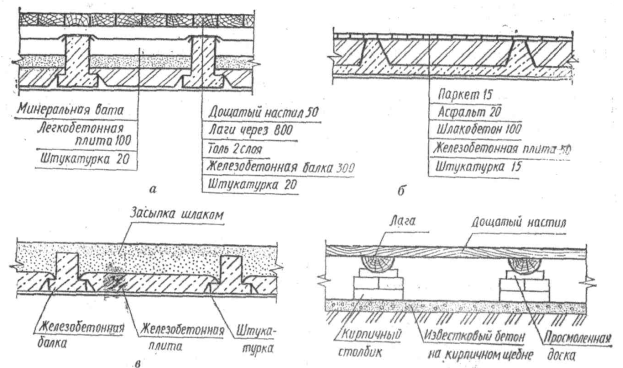 Перекрытия и полы. Перекрытия разделяют здание по высоте на этажи (междуэтажные перекрытия — рис. 3, а, б), отделяют верхний этаж от чердака (чердачное перекрытие), а первый этаж от подвала (подвальное перекрытие ). Каждое перекрытие состоит из несущей части и наполнителя. Несущие конструкции собирают из деталей индустриального изготовления — балок, плит, панелей и др. Наполнители обеспечивают звуко- и теплоизоляционные свойства и должны отвечать противопожарным нормам. На рис. 4 указано, из каких слоев состоит наполнитель и толщина каждого слоя. Полы собирают из шпунтовых досок, которые опираются на деревянные лаги (рис. 4, г). Паркетные полы выполняют из мелких дощечек (клепок), изготовленных из твердых пород дерева.