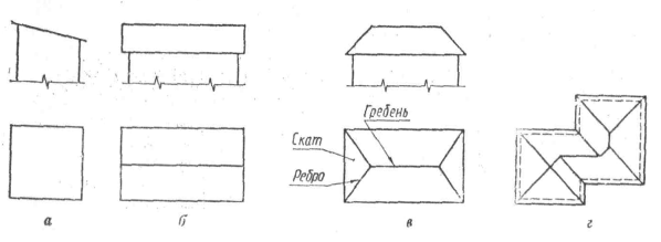Крыша защищает здание от атмосферных осадков, ветра и солнца. Крыши бывают односкатные (рис. 5, а), двухскатные (рис. 5, б), четырехскатные — вальмовые (рис. 5, в) и плоские. Более сложный план крыши изображен на рис. 5, г. Наклон скатов крыши зависит от климатических условий и материала кровли. Например, для кровли из силикатных материалов наклон принимают 270...450, для кровли из рулонных материалов (толь, рубероид) — 7° и т. д.