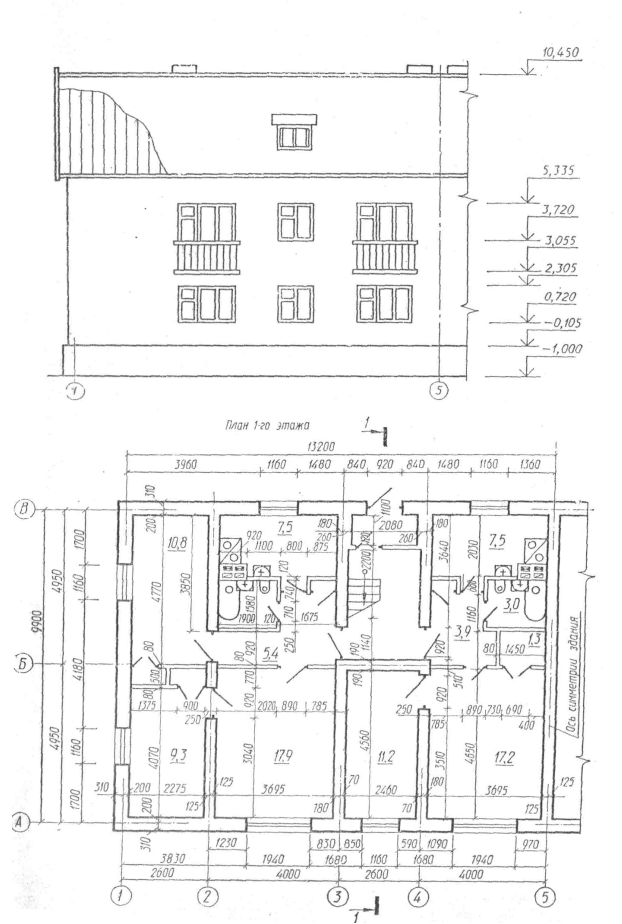 Рис.7 Планы, разрезы и фасады зданий Планы этажей изображают в виде разрезов горизонтальными плоскостями, проходящими через дверные и оконные проемы здания (рис. 8). По плану можно представить форму и размеры здания, расположение комнат, колонн, оконных и дверных проемов, толщину стен и перегородок, размещение лестниц, санитарно-бытового и технологического оборудования и др. На планах промышленных зданий указывают железнодорожные пути, станки, подъемно-транспортные механизмы и т. п. План вычерчивают для каждого этажа и делают над ним надпись: «План 1-го этажа», «План 2-го этажа» и т.д. Для вычерчивания плана вначале наносят сетку разбивочных осей стен и колонн. Слева и снизу оси заканчивают кружками диаметром 7...9 мм, в которых проставляют марки осей. Оси, расположенные вдоль здания, маркируют снизу вверх буквами русского алфавита, а расположенные поперек здания — слева направо арабскими цифрами. После нанесения осей вычерчивают план здания и условными знаками наносят расположение окон, дверей, лестниц, печей, санитарно-технического оборудования и т. п. Стены, попавшие в сечение, не заштриховывают. За габаритами плана указывают следующие размеры (начиная от стены): а) размеры простенков, оконных и дверных проемов; б) расстояния между разбивочными осями; в) расстояния между крайними осями стен. Внутри плана указывают: а) привязку внутренних стен и перегородок к разбивочным осям; б) толщину стен и перегородок; в) размеры помещений в свету; г) размеры дверных проемов, печей и других конструктивных элементов. На плане проставляют площадь отдельных помещений в квадратных метрах. Наименование помещений и их площадь подчеркивают. Разрезы зданий. При помощи разрезов выявляют внутреннюю конструкцию здания: высоту этажей, глубину заложения фундамента, конструкцию перекрытий и лестниц, высоту дверных и оконных проемов и др. (рис. 9). В зависимости от положения секущей плоскости различают разрезы продольные и поперечные. Секущие плоскости располагают так, чтобы в разрез попали дверные и оконные проемы и наиболее сложные в конструктивном отношении части здания: лестничные клетки, шахты подъемников, световые фонари и т. п. Попавшие в разрез элементы конструкции здания полностью не вычерчивают, а показывают лишь контурами. Например, междуэтажное перекрытие изображается двумя линиями на уровне пола и потолка, а конструкция перекрытия указывается в виде выносного элемента или последовательной записью всех составных частей перекрытия. Контуры здания, попавшие в разрез, обводят линией толщиной 0, 8... 1 мм, а элементы, расположенные за секущей плоскостью, — линией толщиной 0, 3 мм.