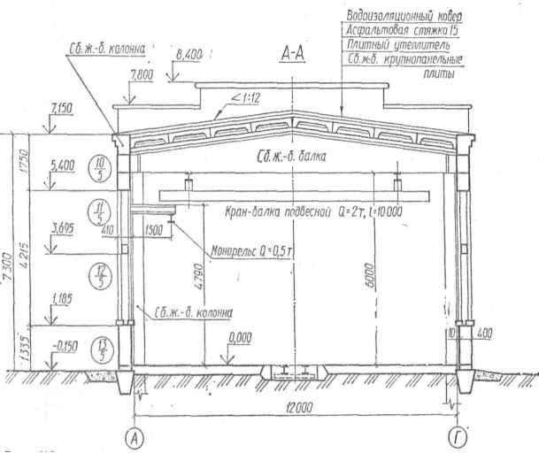 На рис. 8 изображен план восьми квартирного жилого дома. Здание имеет прямоугольную форму и по оси 5 делится поперечной стеной на две симметричные секции. Секция каждого этажа состоит из двух изолированных квартир — трех- и двухкомнатных, с кухнями и санузлами. Кухня оборудована газовой плитой и раковиной. Отопление — центральное. Дымовая труба имеет только вентиляционные каналы. Оси продольных стен здания обозначены буквами А, Б и В, а поперечных — цифрами 1, 2, 3. Внешние стены имеют толщину 510 мм (два кирпича), внутренние — 250 мм (один кирпич). Перегородки в различных местах имеют толщину 80 и 120 мм. На плане указаны размеры между осями стен, оконными и дверными проемами, размеры простенков с привязкой их к разбивочным осям здания. Площадь комнат указана в квадратных метрах и подчеркнута чертой. На рис. 9 изображен разрез здания по лестничной клетке. Из разреза видно, что фундамент — ленточный из бутового камня, внешние и внутренние стены — кирпичные, оконные и дверные перемычки — железобетонные, лестница собрана из сборных железобетонных элементов, стропила — деревянные, досчатые с обрешеткой брусками, покрытие крыши выполнено волнистыми асбоцементными плитами. Междуэтажные и чердачное перекрытия условно показаны двумя линиями. В пояснительных надписях указано, из каких элементов слагается перекрытие. На разрезе проставлены отметки пола, потолка, оконных и дверных проемов, фундамента, конька и других элементов здания. Нулевую отметку имеет пол первого этажа. Указанные размеры дают представление о высоте помещений, окон, толщине стен, ширине лестничной клетки и других частей здания. На рис. 8 изображен главный фасад этого здания. Из чертежа видно, что здание двухэтажное с выходами во двор имеет четыре балкона, выходящие на улицу. Крыша здания двухскатная со слуховыми окнами. Здание имеет четыре трубы. С правой стороны главного фасада проставлены отметки тротуара, цоколя, оконных проемов, балконов и конька крыши. На рис. 10, а изображен главный фасад арматурного цеха, на рис.10, б — план цеха, а на рис. 11 — разрез этого здания. Из чертежей видно, что здание цеха одноэтажное однопролетное прямоугольной формы с шириной пролета 12 м и высотой 6 м; к правому крылу здания примыкают контора и бытовые помещения (гардеробы и санузел). Через весь цех проходит узкоколейная железная дорога. Цех оборудован монорельсом грузоподъемностью 0, 5 ти электрическим кран-балкой грузоподъемностью 2 т. В правом верхнем углу на плане цеха предусмотрены фундаменты под оборудование. На плане указан тип пола (тип 1) и направление открывания дверных створок.