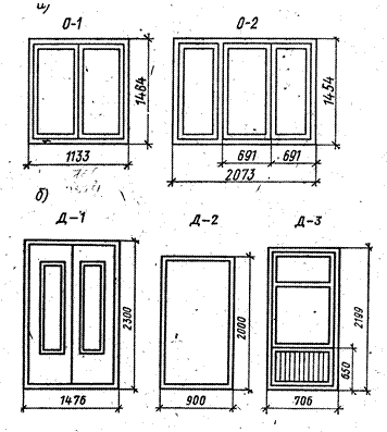 План этажа представляет собой горизонтальный разрез здания по линии оконных проемов. Чертеж плана дает представление о конфигурации здания, расположении всех помещений этажа, их связи между собой, их размере и форме, расположении лестниц, оконных и дверных проемов и т. д. Его рекомендуется вычерчивать в такой последовательности: нанести сетку разбивочных осей, затем вычертить наружные и несущие внутренние стены и перегородки в соответствии с правилами привязки их к разбивочным осям, показать оконные и дверные проемы, лестничные марши, санитарно-технические приборы, вентиляционные и дымовые каналы. После этого нанести все необходимые наружные и внутренние размеры. Внутри плана здания проставляют ширину, глубину каждого помещения, толщину стен и перегородок и размеры дверных проемов. На плане указывают площади помещений в м2 (цифры подчеркиваются). Вне контура плана наносят три линии (цепочки) размеров: на первой (считая от контура плана) — размеры проемов и простенков, с привязкой их к разбивочным осям; на второй — расстояния между разбивочными осями; на третьей — расстояния между крайними разбивочными осями с привязкой крайних осей к наружной плоскости стены. Первую линию размеров наносят на расстоянии 14 - 21 мм от контура стены, последующие — на расстоянии 7 мм друг от друга. Разбивочным осям присваивают марку, которую помещают на конце оси в кружке диаметром 7 мм. Вертикальные оси обозначаются слева направо арабскими цифрами, горизонтальные оси — снизу вверх — русскими заглавными буквами в алфавитном порядке. Размеры оконных (0-1, 0-2) и дверных (Д-1; Д-2; Д-3) проемов принять по ГОСТ (рис. 14, а и 14, б).