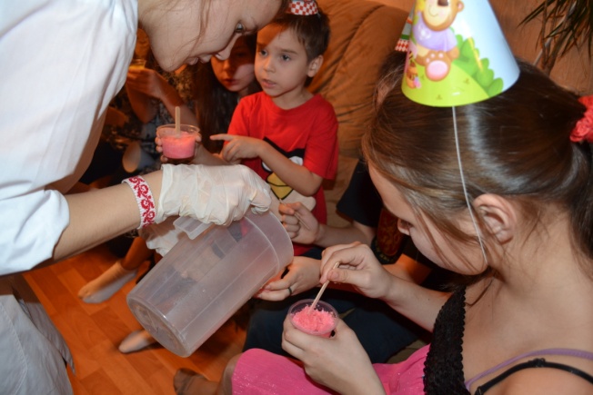 • увидят фиолетовый туман в колбе; • узнают, как можно сделать фонтан при помощи газировки; • проведут эксперимент с шипучими конфетами; • запустят вместе с учёным необычные хлопушки;