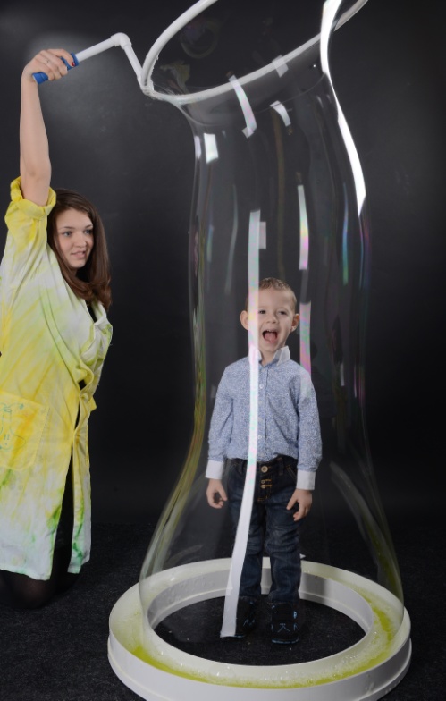 · Первую половину ШОУ занимает мастер-класс от артиста, вы увидите пузыри различных размеров от самых маленьких до гигантских, каскад из пузырей, пузырь на ладошке, пузырь в пузыре, фигуры из пузырей, горящий пузырь!