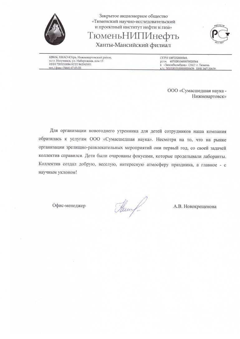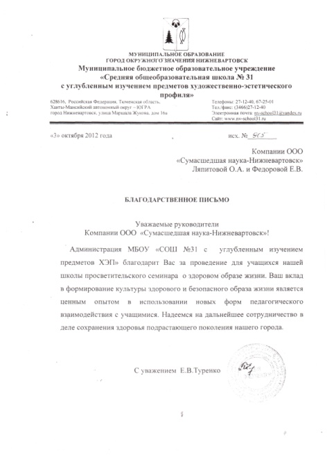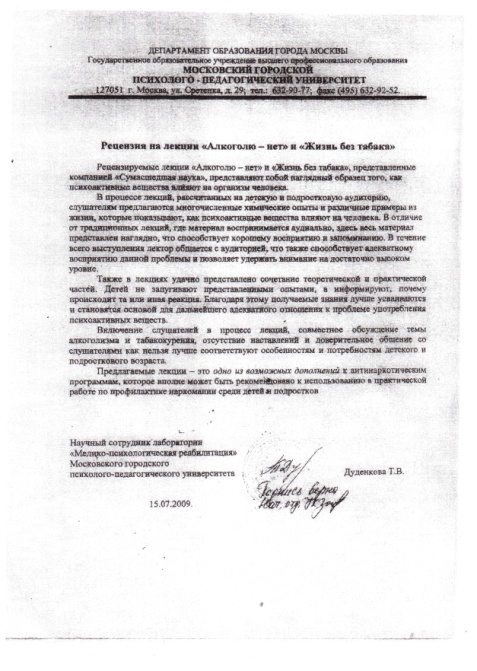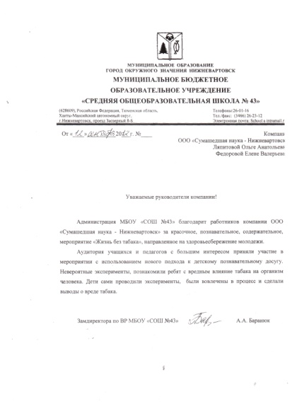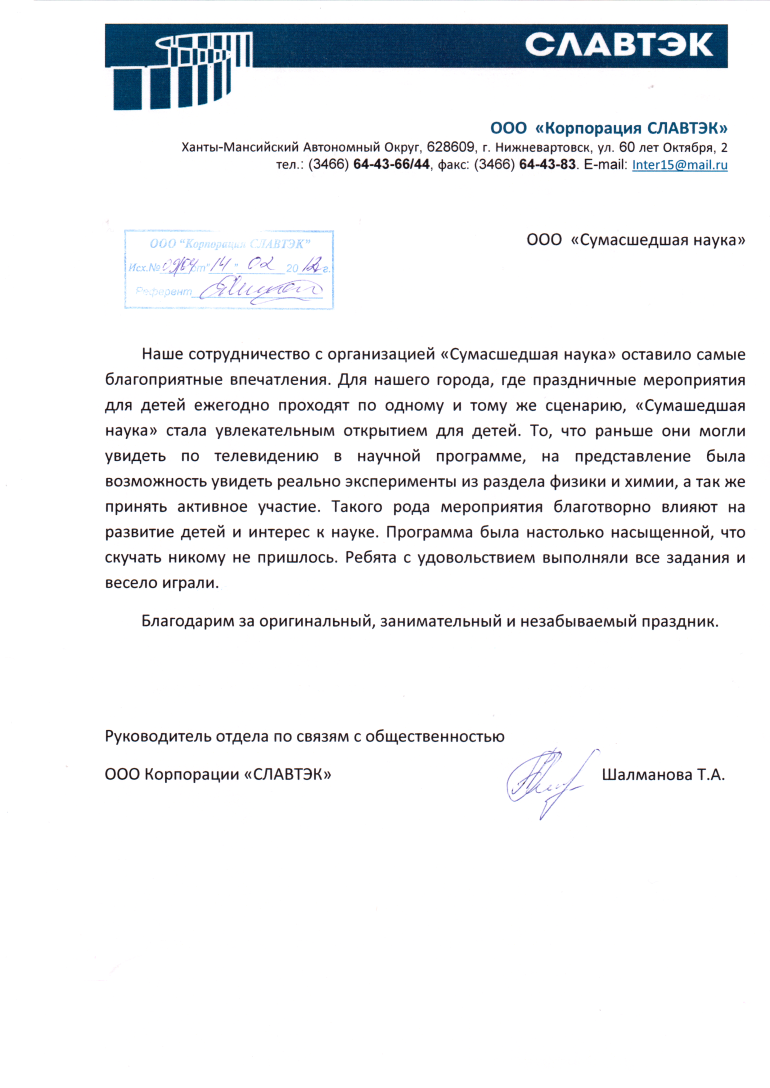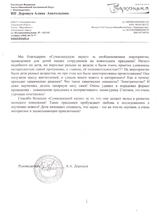 Дорошук Алина Анатольевна (Кухонька)04.05.2013г программа «Все без ума от синего!» 5! 5! Отличные впечатления! Гимназия № 2 Политова Тамара Аркадьевна 24.01.2013г программа «Жизнь без табака!»: 5! Мероприятие познавательное, в доступной форме, зрелищное! Заляева Любовь Александровна (12 школа); 08.11.2012г. программа «Чудеса Науки» 5+!, а нет, даже 10+! Море эмоций, узнали много нового, хорошее настроение, отличные учёные! Ещё охота такого праздника=). Всё было отлично! У вас всё прекрасно!