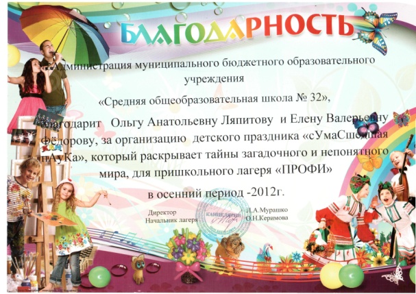 Новикова Любовь Васильевна (лицей): 13.06.2012г. программа «Свет! Цвет! Мотор!» Восхитительно!!! Всё отлично! Баранюк А.А.(43 школа): 12.09.2012г программа «Жизнь без табака» 5! Супер! Орлова Т.В. (42 школа): 24.05.2012г. программа «Вертим, щёлкаем, хлопаем!» Праздник очень интересный, познавательный, веселый. Спасибо!