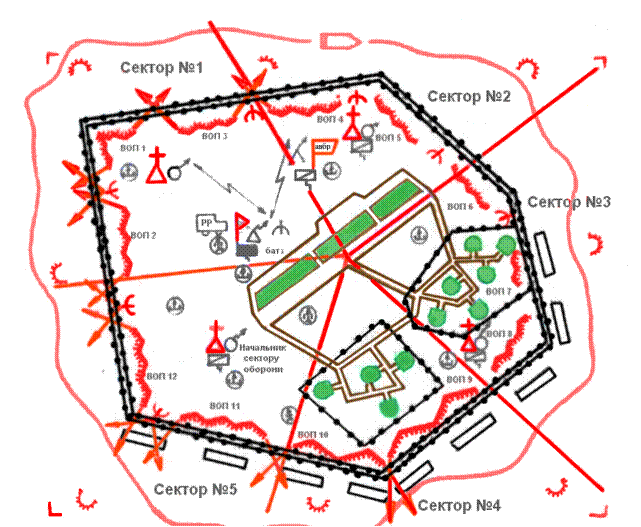 Наземна оборона і охорона аеродромів організовується з метою виключення діянь диверсійно-розвідувальних груп, повітряного (морського) десанту противника; військ противника прорвавших нашу оборону; терористичних угруповань; забезпечення цілісності зброї, техніки і запасів матеріальних засобів; запобігання несанкціонованого зльоту літаків та вертольотів, а також для затримки літальних апаратів противника, які приземлилися. Відповідальність за організацію охорони і оборони аеродрому(авіаційної частини) покладається на старшого авіаційного начальника – командира авіаційної частини. Він є начальником оборони аеродрому(частини).Його заступники: з наземної оборони – начальник штабу авіаційної частини; з ППО(як відомо) – командир частини(підрозділу ППО, що прикриває аеродром). Охорона та оборона місць дислокації авіаційної частини організовується на підставі рішення командира частини, як начальника оборони аеродрому та здійснюється силами та засобами роти (батальйону) охорони з залученням особового складу інших підрозділів авіаційної частини. Рішення командира авіаційної частини на охорону та оборону місць дислокації оформляється у вигляді плану охорони та наземної оборони і пояснювальної записки до нього. Охорона аеродромів здійснюється внутрішніми вартами, вартами ВОХОР, сторожовою охороною, патрульними, підрозділами протидії диверсіям та терористичним актам, добовим нарядом. Батальйон охорони здійснює охорону об’єктів несенням вартової та патрульної служб на території дислокації авіаційної частини. Кількість виділених для охорони сил та засобів залежить від важливості об’єктів, їх кількості і розмірів, умов розміщення, характеру місцевості та інших умов обстановки. Охорона літаків, військових об’єктів на аеродромі здійснюється вартами згідно з вимогами Статуту гарнізонної та вартової служб Збройних Сил України. На АРЗ охорона літаків здійснюється особовим складом воєнізованої охорони. Охорона літаків чергового підрозділу і засобів наземного забезпечення польотів здійснюється особовим складом чергової зміни відповідно до Інструкції по організації бойового чергування, яка затверджена командиром авіаційної частини, виходячи з місцевих умов базування. Підтримання внутрішнього порядку й відповідальність за збереження АТ та військових об’єктів на аеродромі в робочий час покладається на чергових стоянок частин і підрозділів, які щоденно призначаються наказом по частині. Під час роботи особового складу на стоянках за збереження літаків, обладнання та майна підрозділу, яке знаходиться на стоянці, відповідає ІТС, за яким закріплені літаки. Допускати сторонніх осіб до літаків і об’єктів без дозволу командира підрозділу, заступника командира підрозділу з озброєння та їх прямих начальників забороняється. Наземна оборона аеродромів будується коловою і ешелонованою по глибині. Основу її складають система опорних пунктів (оборонних позицій), рухомий резерв, зенітно-артилерійські засоби на вогневих позиціях та інженерні загородження. Створення оборонних споруд включає улаштування вогневих позицій, протитанкових і протипіхотних загороджень, підготовку до оборони окремих об’єктів і будівель. В першу чергу обладнуються оборонні споруди для прикриття пунктів управління і зон розосередження. 