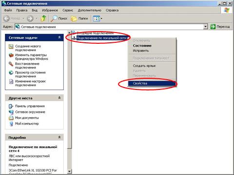 В «Сетевые подключения» нужно нажать правой кнопкой мыши на «Подключение по локальной сети» и выбрать меню свойства, если у вас несколько «Подключений по локальной сети» нужно выбрать именно то, к которому подключен сетевой кабель от маршрутизатора.