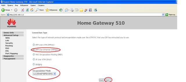 5) В открывшемся окне выберите следующие параметры: a) Connection Type: PPP over Ethernet (PPPoE) b) Encapsulation Mode: LLC/SNAP-BRIDGING; Нажмите «Next»