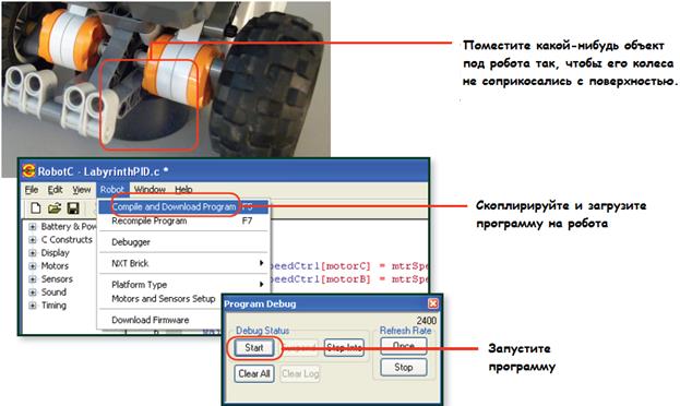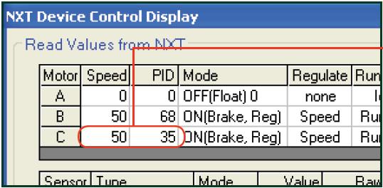 В этом окне располагается отладчик устранения неисправностей, который может помочь вам узнать, что ваш робот делает и «думает». Но здесь нас интересуют только: " Скорость" и " PID" для двигателей C и B. Колонка скоростей показывает нужную скорость для двигателя, которую мы устанавливаем на 50%. PID колонка показывает фактическое количество энергии, что робот дает двигателю, чтобы заставить его двигаться на такой скорости.