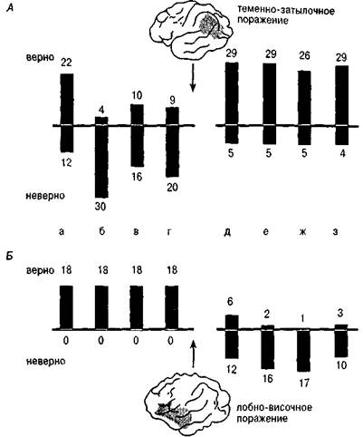 А Б У больных с афферентной моторной афазией нередко нарушен и оральный (неречевой) праксис. У них затруднено произвольное выполнение разных оральных движений по инструкции, а также по показу. Например, больной не может надуть одну или обе щеки, высунуть язык, облизать губы и т. п. Эти движения не входят в состав речевой деятельности, они более просты, примитивны, тем не менее часто и такие движения распадаются вследствие общих трудностей произвольного управления оральным аппаратом. Однако нередко афферентная моторная апраксия протекает на фоне полностью сохранного орального праксиса. В этих случаях страдает управление лишь более сложными артикуляторными движениями. Нарушения только орального праксиса при сохранности речевой моторики наблюдаются при поражении нижнетеменных отделов правого полушария (у правшей). Трудности артикулирования звуков речи у больных с афферентной моторной афазией проявляются в разных заданиях, например в задании повторить определенные звуки речи (несколько гласных звуков). Быстрое повторение гласных звуков обычно выявляет артикуляционные дефекты даже у больных с тонкими симптомами моторной афферентной афазии. Еще большие трудности возникают в случае повторения согласных звуков, произносимых с помощью близких артикулем, а также слов с сочетанием согласных, сложных в артикуляционном отношении (типа «пропеллер», «пространство», «тротуар» и др.). Характерно, что такие больные обычно понимают, что они произносят слова неверно, чувствуют свою ошибку, но их язык как бы не подчиняется их волевым усилиям. При афферентной моторной афазии вследствие кинестетического дефекта вторично нарушаются и другие Хомская Е. Д. Х = Нейропсихология: 4-е издание. — СПб.: Питер, 2005. — 496 с: ил. 123 формы речи. Как уже говорилось выше, у подобных больных нарушено письмо (как самостоятельное, так и под диктовку), причем даже при тонком речевом дефекте затруднение артикуляции ведет к ухудшению написания слов. Чтение вслух хорошо упроченных (привычных) слов более сохранно, но сложные слова так же, как и в активной устной речи, произносятся неверно, с литеральными заменами1. Семантическая афазия (или так называемая семантическая афазия — по А. Р. Лурия) возникает при поражении зоны ТРО (temporalis-parietalis-occipitalis) — области коры, находящейся на границе височных, 1 Некоторые авторы выделяют как самостоятельную форму «проводниковую афазию». Однако А. Р. Лурия рассматривал ее как вариант афферентной моторной афазии. теменных и затылочных отделов мозга: 37-го и частично 39-го полей слева (рис. 40, Г). Зона ТРО относится к третичным областям коры, или к заднему ассоциативному комплексу. Название «семантическая афазия» А. Р. Лурия считал неудачным, так как в этом случае распадается не вся речевая семантика, а лишь строго определенные семантические категории; в связи с этим А. Р. Лурия нередко обозначал ее «так называемая семантическая афазия» (А. Р. Лурия, 1962, 1975а, б и др.). Поскольку речевая семантика в той или иной степени страдает при любой форме афазий, обозначение ее как семантической неправильно и по существу. Тем не менее это название вошло в литературу. Долгое время нарушения, возникающие при этой форме афазий, описывались как интеллектуальный дефект. Так, К. Гольдштейн предполагал, что у данной категории больных имеется общее снижение интел