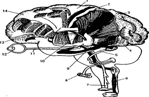 Эта модель, предложенная А. Р. Лурия (1970, 1973), характеризует наиболее общие закономерности работы мозга как единого целого и является основой для объяснения его интегративной деятельности. Согласно данной модели, весь мозг может быть подразделен на три основных структурно-функциональных блока: I — энергетический блок, или блок регуляции уровня активности мозга; II — блок приема, переработки и хранения экстероцептивной (т. е. исходящей извне) информации; III — блок программирования, регуляции и контроля за протеканием психической деятельности. Каждая высшая психическая функция (или сложная форма сознательной психической деятельности) осуществляется при участии всех трех блоков мозга, вносящих свой вклад в ее реализацию. Они характеризуются определенными особенностями строения, физиологическими принципами, лежащими в основе их работы, и той ролью, которую они играют в осуществлении психических функций (рис. 5). Рис. 4. Вертикальная организация основных анализаторных систем: 1 — двигательная область; 2 — соматосенсорная область; 3 — теменная кора; 4 — зрительная область; 5 — слуховые пути; 6 — пути мышечной чувствительности; 7 — пути кожной чувствительности; 8 — ухо; 9 — зрительное сияние; 10 — ядра зрительного бугра; 11 — зрительный путь; 12 — глаз; 13 — орбитальная кора; 14 — префронтальная кора (по Д. Пейпецу)