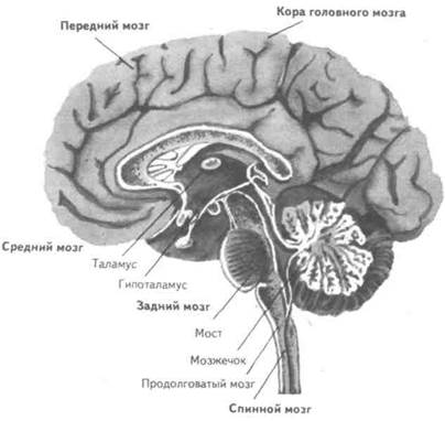 ские действия соответствовали друг другу. На физиологическом уровне функцию объединения (интеграции) всего этого обеспечивает нервная система. Она и анатомически расположена, устроена так, чтобы иметь прямой доступ и выход на внутренние органы, на внешнюю среду, соединять их, управлять органами движения. Нервная система человека состоит из двух разделов: центрального и периферического. Центральный включает головной мозг, промежуточный и спинной мозг (рис. 4). Вся остальная часть нервной системы относится к периферической. Центральная нервная система (ц.н.с), если ее рассматривать более детально, состоит из переднего мозга, среднего мозга, заднего мозга и спинного мозга. В этих основных отделах центральной нервной системы в свою очередь выделяются важнейшие структуры, имеющие прямое отношение к психическим