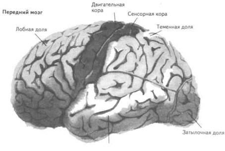 Рис. 8. Вид мозга человека сбоку. На рисунке показаны важнейшие сенсорные и двигательные зоны к.г.м. Информация от всех органов чувств, так же, как и текущая информация, связанная с программами движений, объединяется лобной корой, которая представляет собой высший уровень мозговой регуляции психики и поведения