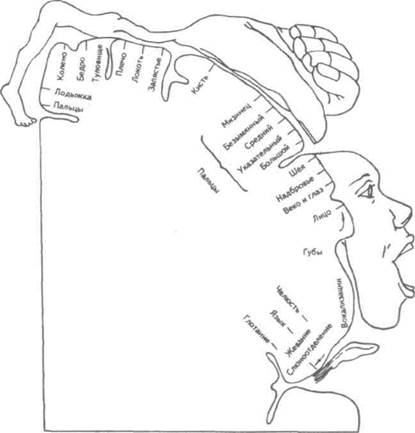 Рис. 10. Двигательная область коры головного мозга человека. На этом рисунке показаны участки двигательной коры, стимуляция которых приводит к сокращению определенных групп мышц. В частности, отдельные области, по-видимому, могут кодировать угловое положение суставов, приводимых в движение соответствующими мышцами в работе левого и правого полушарий. Затем, по мере старения, эта специализация вновь утрачивается. Особую роль в регуляции многих психических процессов, свойств и состояний человека играет ретикулярная формация (рис. 8)1. Она представляет собой совокупность разреженных, ! В этой главе автор опирается на данные и пользуется несколько видоизмененными рисунками, имеющимися в двух книгах: Прихологический словарь/ Под ред. В.В.Давыдова и др. — М., 1983. Блум Ф., Лейзерсон А., Хофстедтер Л. Мозг, разум, поведение. — М., 1988.