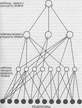 Рис. 21. Схема рецептивных полей разного уровня коры головного мозга (или одного и того же нейрона более высокого уровня в нервной системе). На рис. 21 изображена схема рецептивного поля нейрона коры головного мозга. Из нее видно, что, прежде чем нервное возбуждение от рецептора попадает в кору, оно переключается на двух промежуточных