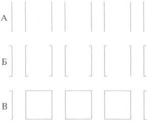 Рис. 36. Действие различных факторов на формирование образа контурной фигуры. А — фактор близости предрасполагает наблюдателя организовать линии в группы по две в каждой. Б — фактор продолжения побуждает видеть в трех средних скобках просто пары линий, как в первом случае. В — замкнутость исключает возможность какой-либо иной группировки линий