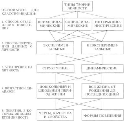 В конце 30-х годов нашего-века в психологии личности началась активная дифференциация направлений исследований. В результате ко второй половине нашего века сложилось много различных подходов и теорий личности. Воспользуемся для краткого их рассмотрения обобщающей схемой, представленной на рис. 57. Если подходить к определению современных теорий личности формально, то в соответствии с этой схемой существует по меньшей мере 48 их вариантов, и каждый из них может быть в свою очередь оценен по пяти параметрам, заданным на схеме в виде оснований для классификации. К типу психодинамических относятся теории, описывающие личность и объясняющие ее поведение исходя из ее психологических, или внутренних, субъективных характеристик. Если воспользоваться для символического представления типов теорий формулой, предложенной К.Левином,