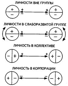 Рис. 72. Влияние групп разного уровня развития на поведение личности и межличностные отношения в группе: (+) — положительное в личности и межличностных отношениях; (—) — отрицательное в личности и межличностных отношениях; (< ->) — отношения; ($) — поворот отношений в любую сторону века в группе определено не только личностью, но и особенностями группы. Замечена такая закономерность: чем ближе по уровню своего развития группа находится к коллективу, тем более благоприятные условия она создает для проявления лучших сторон в личности и торможения того, что в ней есть худшего. И напротив, чем дальше группа по уровню своего развития отстоит от коллектива и чем ближе она находится к корпорации (так называют группу, в которой складываются отношения, противоположные коллективистским), тем большие возможности она предоставляет для проявления в системе взаимоотношений худших сторон личности с одновременным торможением лучших личностных устремлений (рис. 72).