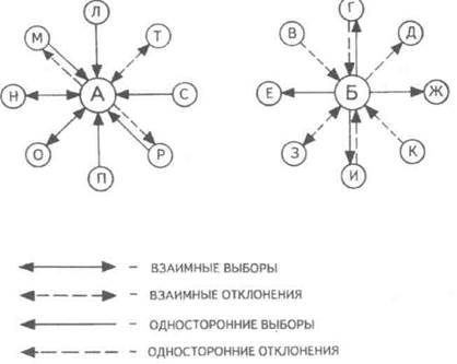 Рис. 75. Масштабная социограмма, наглядно представляющая взаимоотношения в группе, включающей 11 человек. На рисунке видно четкое разделение данной группы на две подгруппы а) и б) со своими лидерами А и Б указывает на характер отношений, а длина свидетельствует о близости этих отношений. Чем ближе друг к другу изображены члены группы на данной социограмме, тем лучше имеющиеся между ними взаимоотношения. Из приведенного на рис. 76 примера видно, что представленная на нем группа включает 11 человек, причем они делятся на две группировки, не связанные между собой определенными отношениями. Каждая из них имеет своего лидера: А и Б. Социограмма-мишень представляет собой систему концентрических окружностей, количество которых обычно равно максимальному числу выборов, полученных лидером. На рис. 76 представлена социограмма-мишень группы, в которой наибольшее число выборов равно 5. Выборы указаны стрелками. В концентрических окружностях члены группы размещены в соответствии с числом полученных ими выборов. Вертикальными и горизонтальными линиями, проходящими перпендикулярно друг другу через центр, вся социограмма-мишень разделена на четыре сектора, представляющих детей разного пола и возраста (всего четыре различных сочетания указанных признаков). При помощи социограммы-мишени можно судить не только о том, кто и какое место занимает в группе, но также о том, какие взаимоотношения сложились между всеми членами группы.