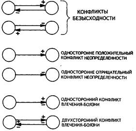 совместимыми, противоположными: один из членов группы относится к другому отрицательно, а второй — положительно, и если ни тот, ни другой не захотят изменить свое отношение, то их взаимоотношения постоянно будут находиться в состоянии несовместимости. Психологически острее этот конфликт может переживаться тем из членов пары, кто, испытывая положительное отношение к партнеру, с его стороны встречает к себе отрицательное отношение. Данный тип конфликта можно разрешить одним лишь способом: полным разрывом отношений между конфликтующими сторонами. Второй тип межличностных конфликтов представляет собой конфликт неопределенности, поскольку при неопределенном (положительном или отрицательном) отношении одного из партнеров к другому он с его стороны не встречает к себе столь же однозначного отношения, ни положительного, ни отрицатель- Рис. 83. Типы межличностных внутригрупповых конфликтов