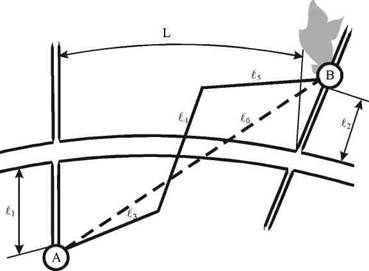 l0 < l1 + L + При наличии некоторого множества возможных маршрутов следования возникает проблемная ситуация, которую можно решить лишь специальными методами теории исследования операций. В этом случае задача может быть сформулирована следующим образом: имеется некоторое множество маршрутов следования от пожарной части А к месту пожара В. Требуется определить маршрут, соответствующий требованию критерия оптимальности выбора маршрута следования. Рассмотрим элементарный пример решения сформулированной задачи. Вначале построим сетевую модель возможных маршрутов следования (рис. 4.7). Далее определяется количество возможных путей (маршрутов) и продолжительность следования по ним. Минимальный по продолжительности путь будет соответствовать оптимальному маршруту следования. На графике (рис. 4.7) кругами обоначены перекрестки, а цифрами-продолжительность движения по улицам. На этом графике всего пять возможных маршрутов следования: первый: АС; СД; ДЕ; ЕВ; второй: АС; СИ; Ж; ЕВ; третий: АИ; Ж; ЕВ; четвертый: АК; КЛ; ЛВ; пятый: АК; КЛ; ЛМ; MB. Продолжительность следования по маршруту и количество перекрестков на них приведены в (таблице 4.1).
