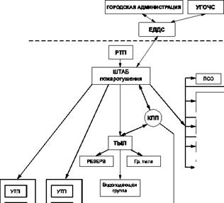 V УТП _4 I r-rS-i I 111 J 1111 Рис. 7.3 Схема управления действиями на пожаре при отсутствии оперативного штаба. РТП в указанных случаях должен выделить в помощь начальнику тыла одного-трех человек начальствующего состава, а также необходимый транспорт и средства связи. РТП управляет тылом через оперативный штаб и связных, выделенных из расчетов, имеющих радиостанции или телефоны. В ходе тушения пожара начальник тыла составляет схему расстановки пожарных автомобилей на водоисточники, составляет необходимые сведения начальнику штаба для заполнения оперативной карточки тушения пожара (количество использованных рукавов, огнетушащих веществ и т.п.). Одним из важнейших условий успешного тушения пожара является бесперебойная подача воды на позиции подразделений. Когда вблизи места пожара нет запаса воды, то тушение организуется подвозом воды пожарными и хозяйственными автоцистернами или подачей воды в перекачку. В этом случае успех в развертывании, сосредоточении сил и средств для тушения пожара во многом зависит не только от четких оперативных действий пожарных подразделений, но и от организаторских, инженерных и тактических способностей командиров и в первую очередь НТ, который, оценив обстановку, должен организовать работу тыла.