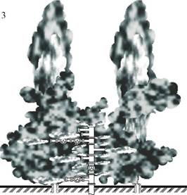 ГЛАВА 10.1. Газовые и нефтяные фонтаны Пожары аварийных газовых и нефтяных фонтанов возникают как при бурении, так и при эксплуатации скважин. Правильная организация тушения пожара требует знаний технологии бурения и эксплуатации скважин, специфики применяемого оборудования и обвязки устья, условий возникновения аварийных ситуаций. Случаи аварийного фонтанирования встречаются в практике довольно часто и все они требуют специального изучения. Характер фонтанирования зависит от состояния устья скважины и ее конструкции, а также от вида работ на скважине. Пожары на фонтанирующей скважине характеризуются по составу: • нефтяные, где нефти больше 50%; • газонефтяные, где нефти 10-50%, • газовые, где 90% газа. По внешним признакам можно различать их по виду пламени и выпадению нефти на площадь, окружающую скважину. По конфигурации пламени (рис 10.1): • компактные (фонтанирование происходит через открытую трубу или эксплуатационную колонку тройник, крестовину); • распыленные (истечение происходит через неплотности в соединениях или когда устье загромождено буровым оборудованием), • комбинированные где имеется распыленный и компяктный факел. По количеству скважин • одиночные • групповые