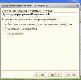 Шаг4. Присваиваем имя создаваемой Информационной базе. Например, допишем свою фамилию. В работе с реальными базами название может содержать названия Организаций. Нажимаем кнопку Далее.