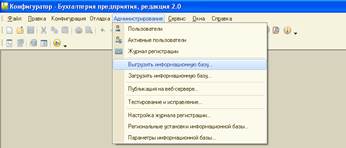 Шаг2. В появившемся интерфейсе программы выбираем меню Администрирование / Выгрузить информационную базу. Далее Указываем папку и название файла архива базы.