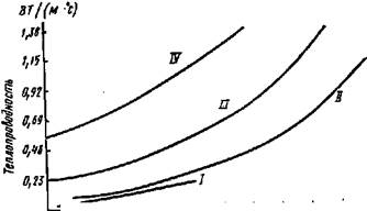 Если требуется выяснить, являются ли поры замкнутыми или сквозными, как распределены они в объеме материала по своим размерам, какое имеется реальное соотношение пор разных диаметров, тогда производят дополнительные исследования с применением специальных методов: ртутной порометрии, сорбционного, капиллярного всасывания и др. Величина пористости и размер пор в значительной мере влияют на прочность материала. При одном и том же веществе строительный материал тем слабее сопротивляется механическим силам, усилиям другого происхождения {тепловым, усадочным и т. п.), чем больше и крупнее поры в его объеме. Для некоторых разновидностей материалов существуют ярко выраженные пропорциональные зависимости: чем меньше средняя плотность (больше пористость), тем меньше прочность материала. От пористости зависят и другие качественные характеристики материала, например способность проводить теплоту и звук, поглощать воду. От пор отличаются пустоты. Они значительно крупнее пор и всегда отчетливо видны, располагаясь между зернами насыпного материала. Поры обычно заполнены воздухом или водой, тогда как вода в пустотах не задерживается, особенно в широкополостных пустотах. При воздействии статических или циклических тепловых факторов материал характеризуется теплопроводностью, теплоемкостью, температуроустойчивостью, огнестойкостью и другими свойствами. Теплопроводность — способность материала проводить через свою толщу тепловой поток, возникающий под влиянием разности температур на поверхностях, ограничивающих материал. Это свойство характеризуется теплопроводностью X, которая показывает количество теплоты, которое проходит через стенку толщиной 1 м и площадью 1 м2 при перепаде температур на противоположных поверхностях в 1°С в течение 1 ч. Величина X имеет размерность в Вт/(м-К); она может служить сравнительной характеристикой при оценке теплозащитных свойств различных материалов, зависит главным образом от пористости материала: содержащийся в порах воздух, особенно в замкнутых, является малотеплопроводной ере-дой, аего теплопроводность Я=0, 023 Вт/(м-К) при температуре -f-20°C (или 293 К). С повышением температуры теплопроводность большинства строительных материалов увеличивается, что объясняется повышением кинематической энергии молекул, слагающих вещество материала: fa=%o(l-\-$t), где Xt и Я0 — теплопроводность соответственно при температурах t и 0°С; р — температурный коэффициент, который показывает величину приращения теплопроводности материала при повышении температуры на 1°С; t — температура материала, °С. Эта формула справедлива томько при температурах не выше t— 100°C; при более высоких значениях t fa определяется опытным путем (рис. 4.4).